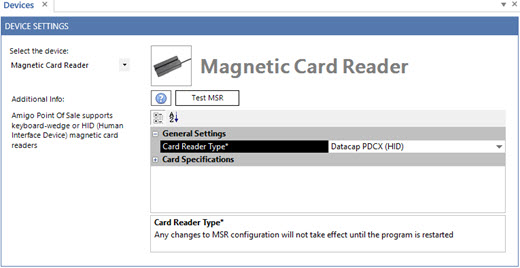 After configuring the device for use with NETePay, open the MSR settings screen in Back Office | Settings | Devices and set the MSR type to Datacap PDCX (HID).