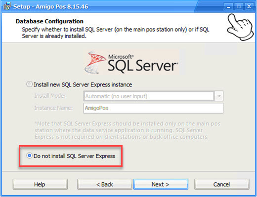 When installing AmigoPOS on the client computer, select Do not install SQL Server Express. Complete the installation and reboot.