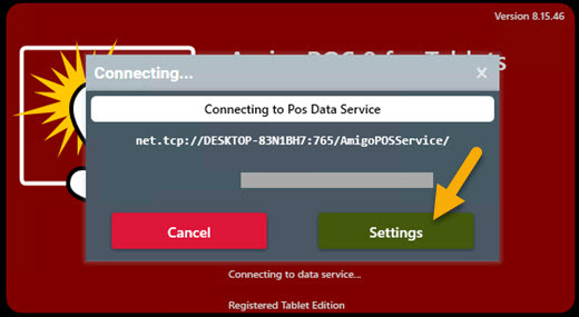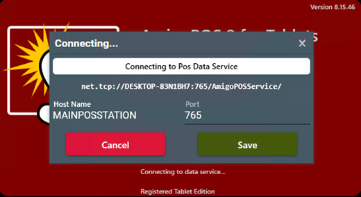 Click Settings and enter the Windows name of the main pos station where the data service application is running. Click Save and the application will resume the connection attempt.